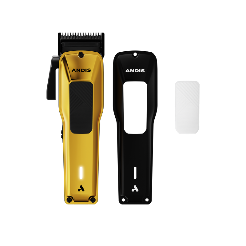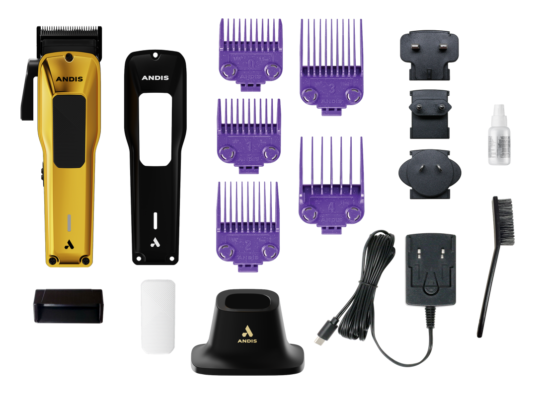Clipper komplektuojamas su auksiniu dangteliu ir juodos tekstūros rankena, antriniu juodu dangteliu ir baltos tekstūros rankena, 5 dvigubo magnetinio priedo šukomis (#0 - 1/16", 1# - 1/8", #2 - 1/4", #3 - 3/8", #4 - 1/2"), ašmenų valymo šepetėliu, aukščiausios kokybės įkrovimo stovu ir ašmenų įkrovimo adapteriu, ašmenų ašmenų įkrovimo adapteriu.