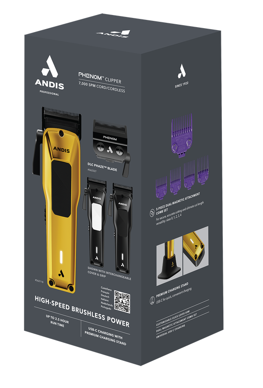 „Phenom Clipper“ pateisina savo vardą su kiekvienu jūsų pjūviu. Su nauju sukamuoju varikliu be šepetėlių, ši kirpimo mašinėlė tiekia didelės spartos galią tiksliam darbui esant 7000 SPM. Išreikškite tikrąjį personalizavimą su specialiu keičiamu metaliniu dangteliu ir tekstūruotomis rankenos spalvomis keturiems skirtingiems deriniams. Toliau tinkinkite savo kirpimo mašinėlę, pakeisdami svirties svirtį iš pjovimo ilgio reguliavimo į spustelėjimą į nespaudžiamą. Sukurkite fenomenalius mišinius, susiaurėjimus ir blukimą naudodami reguliuojamą DLC Phaze ašmenį (dydis 0000-0A) ir mėgaukitės išskirtiniu pjovimo ilgio universalumu, kai suporuosite su pridedamomis dvigubo magneto tvirtinimo šukomis. Įkraukite be vargo naudodami universalų USB-C įkrovimo adapterį arba lengvai atimamą aukščiausios kokybės stovą bet kada ir bet kur.