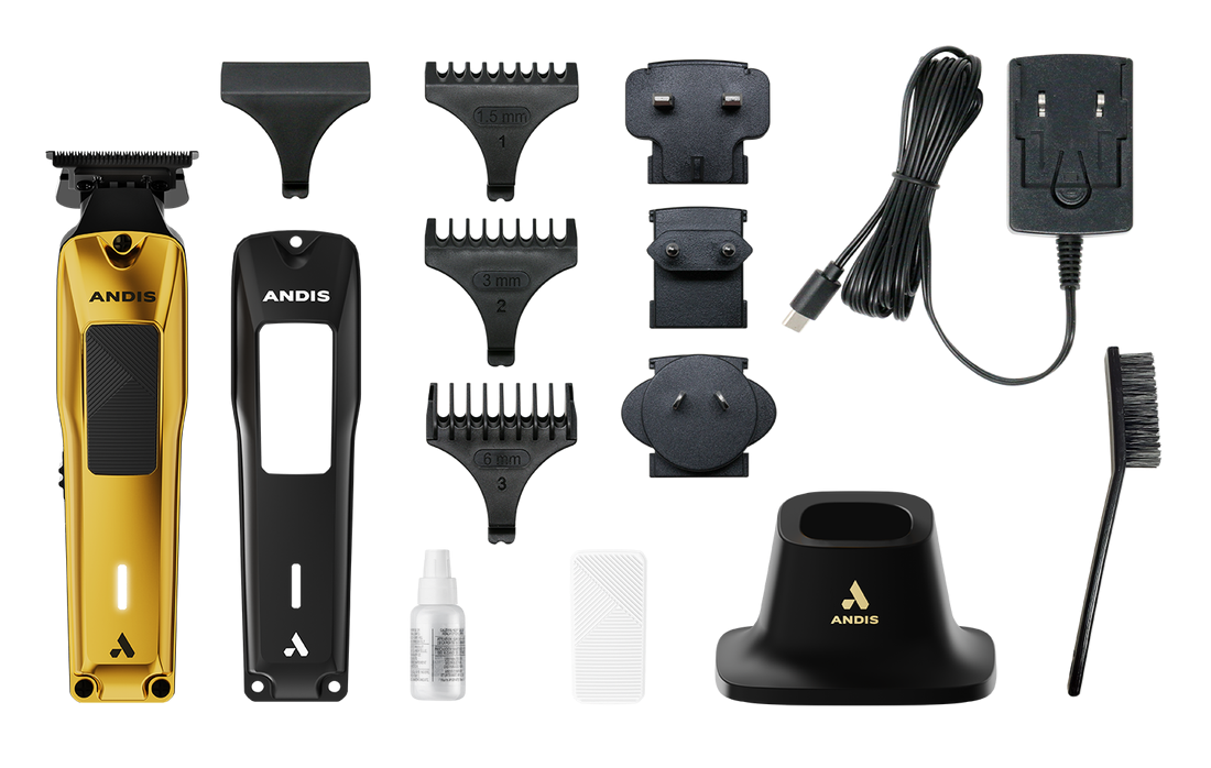 Žoliapjovėje yra auksinis dangtelis ir juodos tekstūros rankena, antrinis juodas dangtelis ir baltos tekstūros rankena, 3 tvirtinimo šukos (1,5 mm, 3 mm, 6 mm), ašmenų valymo šepetys, aukščiausios kokybės įkrovimo stovas, USB-C įkrovimo adapteris, ašmenų alyva ir ašmenų apsauga.