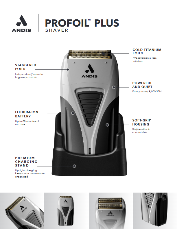 "Andis" profesionalus elektrinis barzdos skustuvas privalumai ir savybės: 9000 aps/min sukamasis nuolatinės srovės variklis; minimalus triukšmas ir vibracija, palyginti su panašiais kitų gamintojų modeliais (pvz., "Wahl 5 Star Shaver"); 100-240 V darbinės įtampos diapazonas, 50-60 Hz dažnis; 80 minučių baterijos veikimo trukmė; ličio jonų akumuliatoriui įkrauti naudojamas pažangus didelio našumo "Holtek Semiconductor" RISC mikrovaldiklis su "flash" atmintimi; saugus ir ergonomiškas; paauksuoti titano tinkleliai užtikrina maksimalią apsaugą nuo nedidelių sužeidimų ir dirginimo net ir jautriai odai; turi dvi nepriklausomas plūduriuojančias galvutes ir peiliukus; pjovimo paviršiai pagaminti iš anglinio plieno; korpusas pagamintas iš kokybiško poliamido su gumuotais įdėklais šonuose; priekyje esantis mygtukas įjungia skustuvą; šoniniame skydelyje esantis mygtukas leidžia nuimti skustuvo galvutes ir jas išvalyti; skustuvai surenkami prekės ženklo gamykloje Kinijoje. "Andis Profoil Lithium Plus" skustuvas TS-2 17205 skustuvo rinkinys: skustuvas; tinklo adapteris; įkrovimo lopšys; valymo šepetėlis; apsauginis galvučių dangtelis; pridedami dokumentai. Svarbu! Šis skustuvas, kaip ir bet kuris kitas mūsų svetainėje esantis skustuvas, nukerpa tik 1-2 mm ražieną (vienos ar dviejų dienų ražieną). Norėdami nukirpti ilgesnius kirpčiukus, prieš tai naudokite kirptuvą.