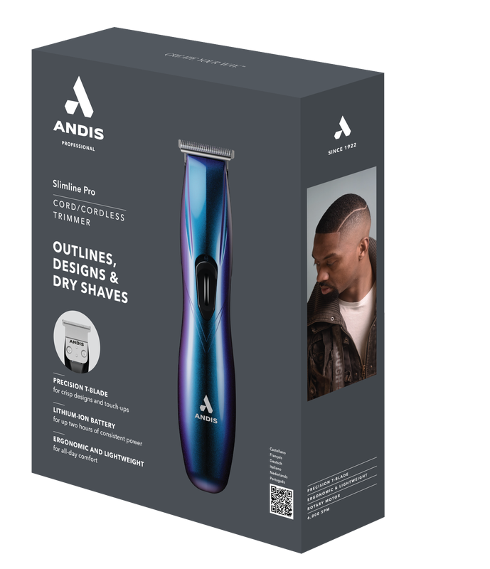 "Andis Slimline® Pro Li" lengvas plaukų kirptuvas su galingu varikliu, skirtas naudoti su laidu arba be laido, idealiai tinka kaklui lyginti ir kontūruoti. Ličio jonų akumuliatorius, 120 minučių naudojimo be įkrovimo 150 minučių visiškai įkrauti akumuliatorių rankiniu būdu reguliuojama geležtė, kad veiktų "0" režimu galimybė dirbti su kabeliu darbinis greitis 6000 apsukų per minutę svoris 0,14 kg Į komplektą įeina: - Įkrovimo stotelė su kabeliu - adapteriai: Europos, Australijos, Didžiosios Britanijos - 4 plastikiniai lizdai (1,55 / 3 / 6 / 10 mm) - Peilis (kat. nr. 17 32225) - peilio valymo šepetėlis - peilių alyva