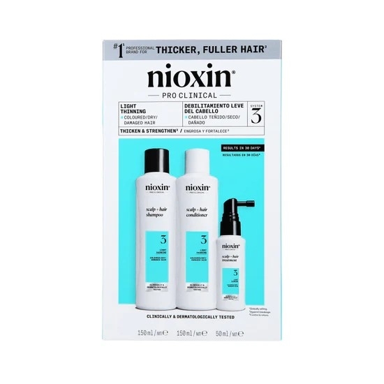 Nioxin System Kit 3 – profesionali 3 žingsnių sistema, apimanti šampūną, kondicionierių ir nenuplaunamą priemonę, kliniškai sukurta kovai su lengvu plaukų slinkimu natūraliems, neapdorotiems plaukams.