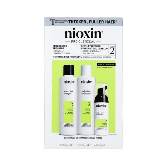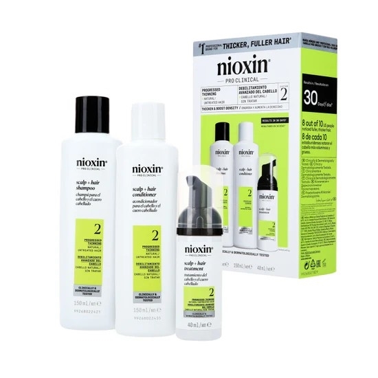 Nioxin System Kit 2 – profesionali 3 žingsnių sistema, apimanti šampūną, kondicionierių ir nenuplaunamą priemonę, kliniškai sukurta kovai su progresuojančiu plaukų slinkimu natūraliems, neapdorotiems plaukams.