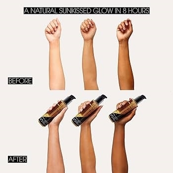 Iš anksto nušveiskite ir sudrėkinkite sausas vietas. Slyskite su mūsų pirštine, naudodami šviesaus aukso blizgesį, kad nepastebėtumėte pleistrų. Dėvėkite 8 valandas, kol subtiliai išryškės natūraliai atrodantis įdegis. Skalauti nereikia. Jei norite gilesnio įdegio, pakartotinai tepkite po 24 valandų. Reguliariai nušveiskite ir drėkinkite, kad pailgintumėte švytėjimą.