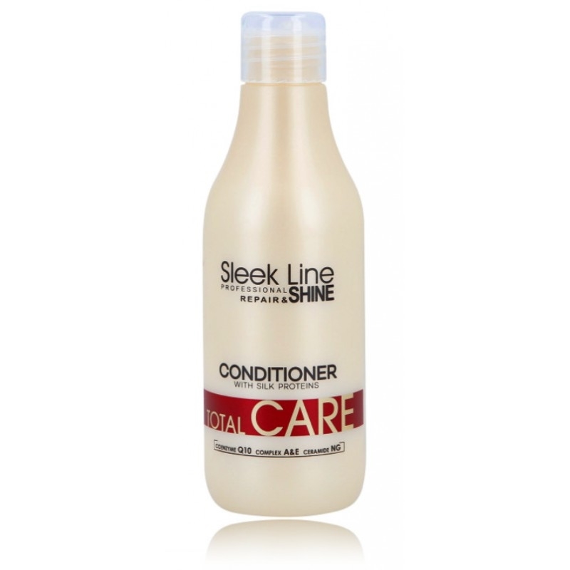 „Total Care“ kondicionierius su šilko baltymais, vitaminais A+E, keramidais ir kofermentu Q10. Kondicionierius skirtas kasdienei sausų, papilkėjusių ir jautrių plaukų priežiūrai. Nuostabiai valo galvos odą, drėkina ir glotnina plaukus, daro juos elastingus ir švelnius. Suteikia blizgesio, palengvina šukavimą ir formavimą. Naudojimas: nedidelį kiekį priemonės užtepkite ant drėgnų plaukų. Palaikykite 3–5 minutes, tada kruopščiai nuplaukite šiltu vandeniu.