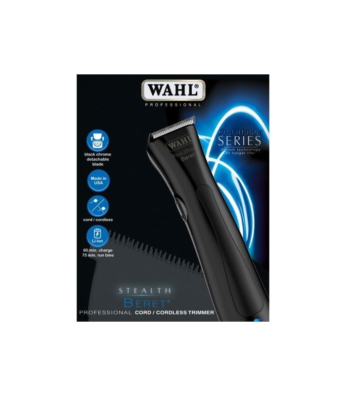 Professional hair trimmer featuring highly efficient and durable Lithium-Ion battery without memory effect. 75 minutes run time and 60 minutes charging time. Appealing brushed chrome finish. Super slim, super quiet and light in weight. Quick-detach chrome-plated blade set. Ideal for close trimming and outlining. Compact charge stand ideal for any workstation.