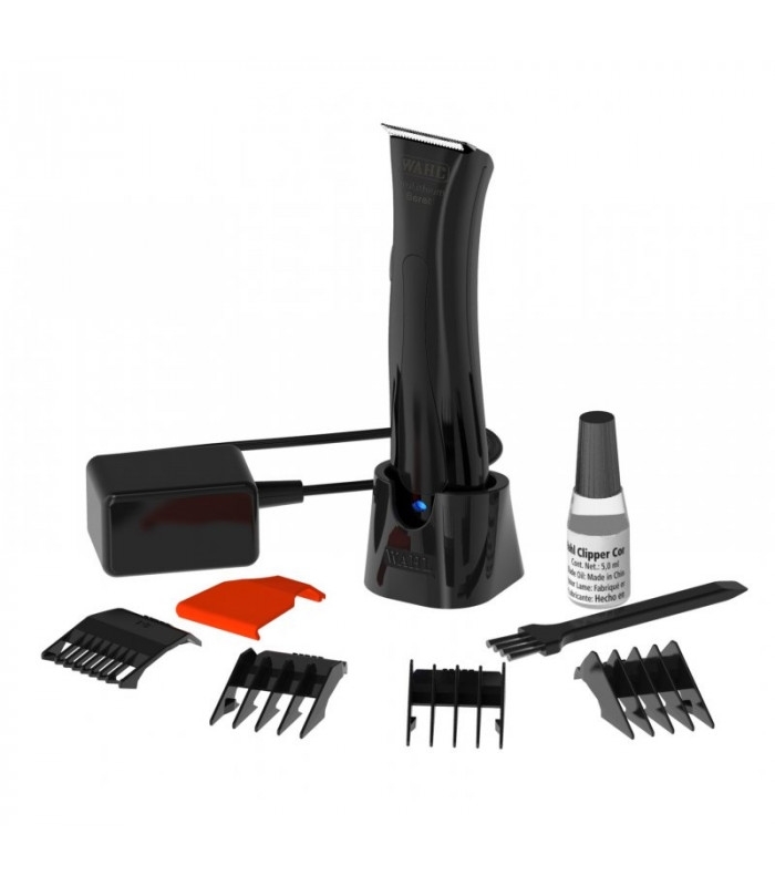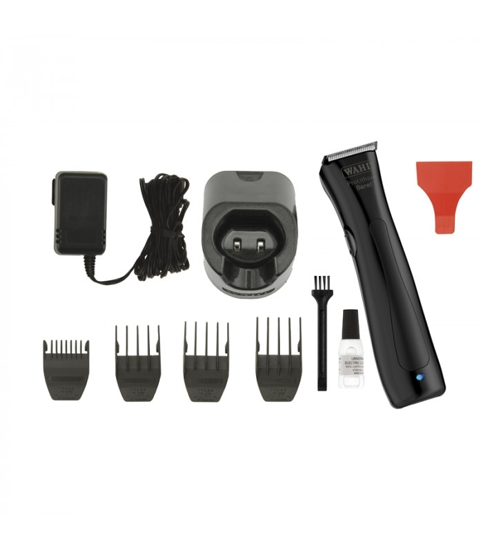Set includes: 4 attachment combs (2.5 mm, 6 mm, 9 mm, 11 mm), charging stand, plug-in transformer, cleaning brush, oil, blade guard