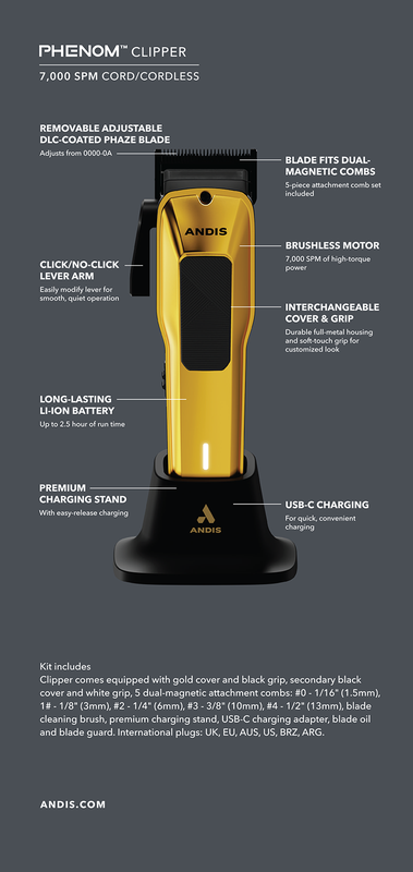 „Phenom Clipper“ pateisina savo vardą su kiekvienu jūsų pjūviu. Su nauju sukamuoju varikliu be šepetėlių, ši kirpimo mašinėlė tiekia didelės spartos galią tiksliam darbui esant 7000 SPM. Išreikškite tikrąjį personalizavimą su specialiu keičiamu metaliniu dangteliu ir tekstūruotomis rankenos spalvomis keturiems skirtingiems deriniams. Toliau tinkinkite savo kirpimo mašinėlę, pakeisdami svirties svirtį iš pjovimo ilgio reguliavimo į spustelėjimą į nespaudžiamą. Sukurkite fenomenalius mišinius, susiaurėjimus ir blukimą naudodami reguliuojamą DLC Phaze ašmenį (dydis 0000-0A) ir mėgaukitės išskirtiniu pjovimo ilgio universalumu, kai suporuosite su pridedamomis dvigubo magneto tvirtinimo šukomis. Įkraukite be vargo naudodami universalų USB-C įkrovimo adapterį arba lengvai atimamą aukščiausios kokybės stovą bet kada ir bet kur.